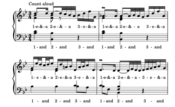 In the Sarabande from Bach’s B flat Partita, I have subdivided the main crotchet beats in half and in quarter. Can you vocalise the counting as you play? You might want to start