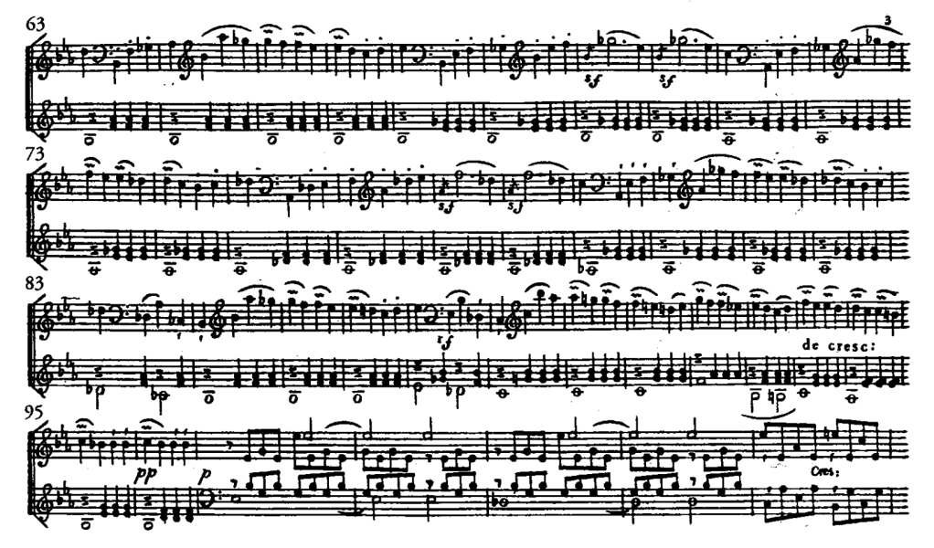 No estoy seguro de que los puntos de los compases 70-71 estén destinados a diferenciar los compases similares con cuñas (79-80), pero los puntos de los compases 82 y 86 quizá ofrecen un timbre y un peso que se pueden contras tar razonablemente con las cuñas de los compases 83-84 y 87-88, que re quieren de una sonoridad más enfática y expresiva, como las cuñas de los últimos dos tiempos de los compases 95 y 96. Los compases 93-99 sólo tienen cuñas, pero el fragmento correspondiente en la re-exposición sólo presenta puntos (compases 257-264). Cualquiera que sea la notación correcta, es indudable que estos últimos son acentos fuertes, y un staccato intenso sería físicamente imposible — es decir, inaudible como tal si uno intentara ejecutarlo. Sin embargo, la diferencia es interesante, ya que debe reflejar inexactamente el interés del compositor por variar la pulsación.