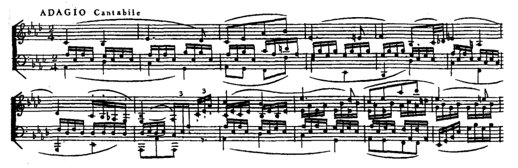 El fraseo se repite casi exactamente en cada regreso del tema, de modo que existe una buena razón para pensar que reproduce correctamente la intención de Beethoven. Exige un final no acentuado en la primera nota del compás 5, lo cual implica un diminuendo muy leve hasta esa nota. Existe una relación similar entre los compases 6 y 7, y los primeros tiempos de los compases 4 y 6 implican un ligero acento inicial, al igual que la segunda mitad de los compases 5 y 7. Las últimas cinco notas del compás 8 están marcadas con cuñas, así como los últimos dos tiempos del 43 y las notas separadas del bajo de los compases 48, 50 y 51 (pero, extrañamente, no las del compás 49, que tiene puntos como los compases 81 y 82, cuya figuración es similar; las últimas notas de los compases 70 y 71 tienen cuñas, lo que indica una ejecución sensible de las notas separadas). Las ligaduras del tema principal en la mano izquierda no están sincronizadas con las de la mano derecha, y el contrapunto rítmico aumenta la riqueza del fraseo. En contraste con nuestros hábitos interpretativos contemporáneos, los finales de la mayoría de las frases del Adagio son breves (compases 8, 16, 23, 36, 44, 58, 66, 68, 70, 71, 72 y 73), y en el segundo episodio en La bemol menor (compases 37 a 50), ninguna de las notas en la mano izquierda es más larga que una corchea, exceptuando la primera, que es una negra que se debe extinguir de inmediato en un silencio de corchea: esto establece un contraste significativo con las prolongadas notas del bajo de las secciones primera y última. También hay un contraste importante entre la melodía sostenida de los primeros dieciséis compases y el subsiguiente estilo parlando que se convierte rápidamente en una sencilla coloratura vocal. En lugar de adornar la última aparición del tema, transferida desde el registro tenor hasta el soprano, una elaboración que habría sido nor mal en la época para un Adagio, Beethoven prolonga el movimiento en tresillos del acompañamiento del segundo episodio hasta el regreso del tema principal, cambiando así la textura en lugar de la melodía.